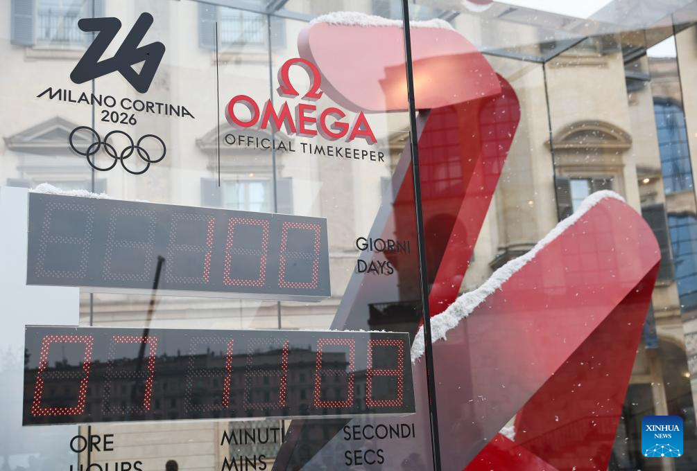 People walk past the digital countdown timer of Milano-Cortina 2026 Olympic Games in Milan, Italy, Oct. 29, 2025. A ceremony marking 100 days to the opening of the Milano-Cortina 2026 Olympic Winter Games was held at Palazzo Lombardia in Milan, where organizers unveiled the official podiums for the Olympic and Paralympic Games and introduced 12 "digital torchbearers", symbolizing the start of the final stage of preparations for the event. (Xinhua/Li Jing)