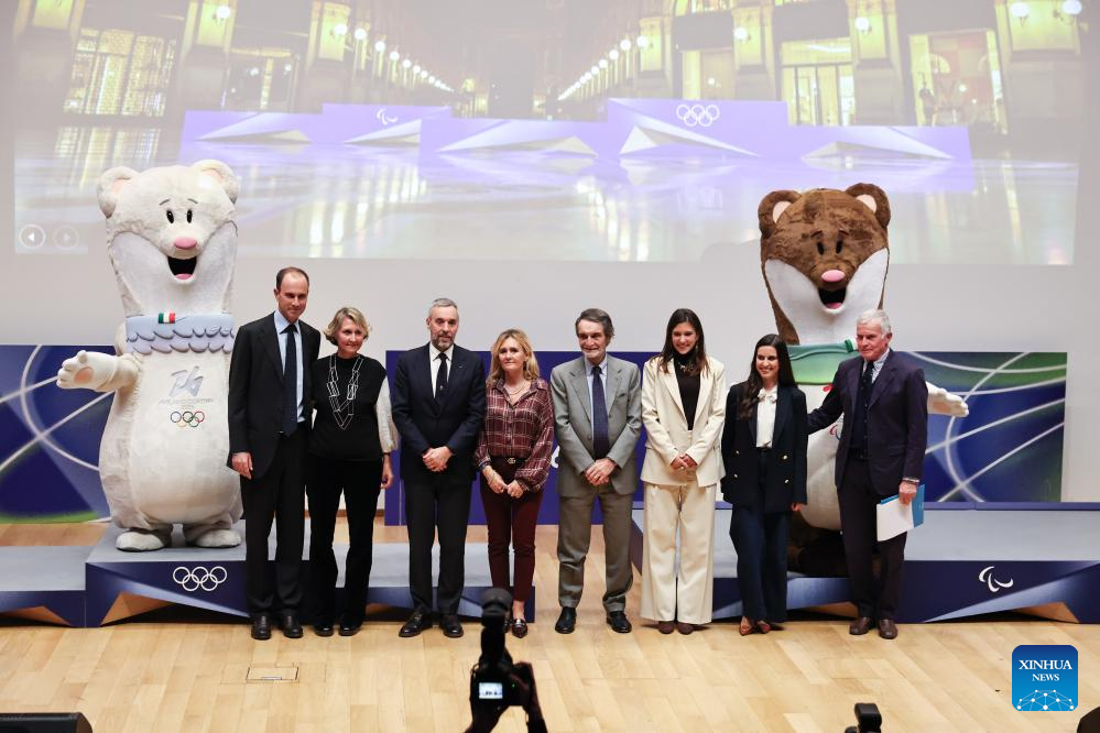 MILAN, Oct. 29 (Xinhua) -- A ceremony marking 100 days to the opening of the Milan-Cortina 2026 Olympic Winter Games was held Tuesday at Palazzo Lombardia in Milan, where organizers unveiled the official podiums for the Olympic and Paralympic Games and introduced 12 "digital torchbearers," symbolizing the start of the final stage of preparations for the event.
