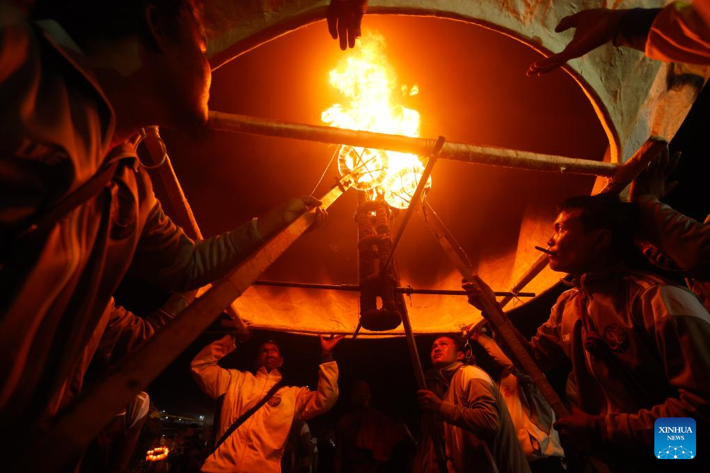 People prepare to release a hot-air balloon during the Taunggyi Hot-Air Balloon Festival in Taunggyi, Shan state, Myanmar, Oct. 30, 2025. (Xinhua/Myo Kyaw Soe)