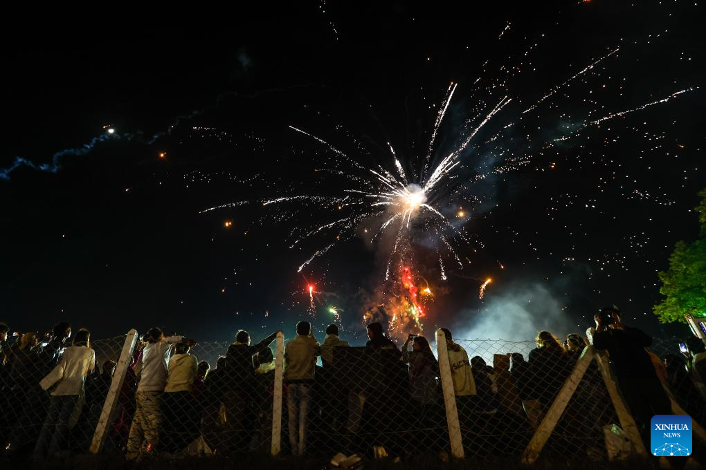 Fireworks explode in the sky during the Taunggyi Hot-Air Balloon Festival in Taunggyi, Shan state, Myanmar, Oct. 30, 2025. (Xinhua/Myo Kyaw Soe)