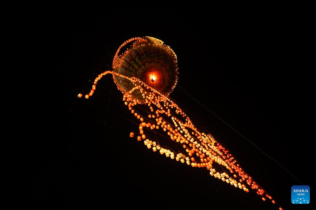 A hot-air balloon carrying small lanterns is pictured during the Taunggyi Hot-Air Balloon Festival in Taunggyi, Shan state, Myanmar, Oct. 30, 2025. (Xinhua/Myo Kyaw Soe)