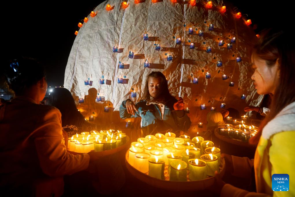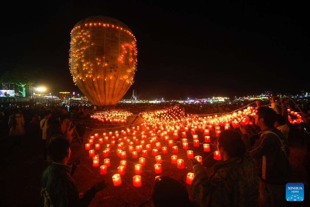 People attach small lanterns to a hot-air balloon during the Taunggyi Hot-Air Balloon Festival in Taunggyi, Shan state, Myanmar, Oct. 31, 2025. (Xinhua/Myo Kyaw Soe)