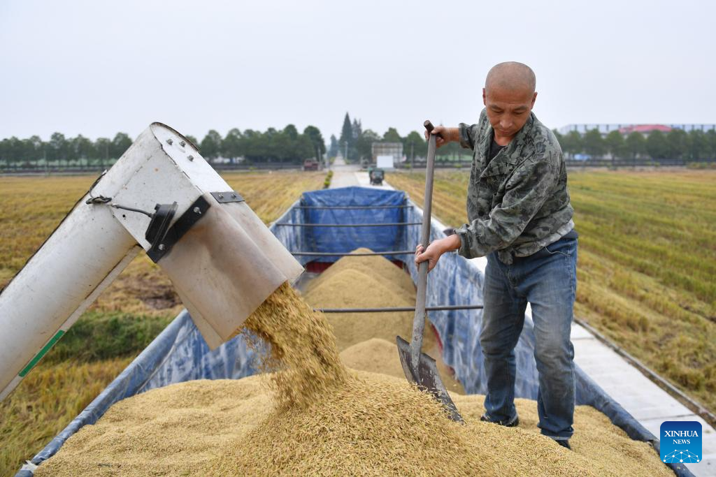This photo shows harvested rice being loaded onto a truck in the fields in Wangjiahu Village, Datonghu District of Yiyang City, central China's Hunan Province, Oct. 29, 2025.