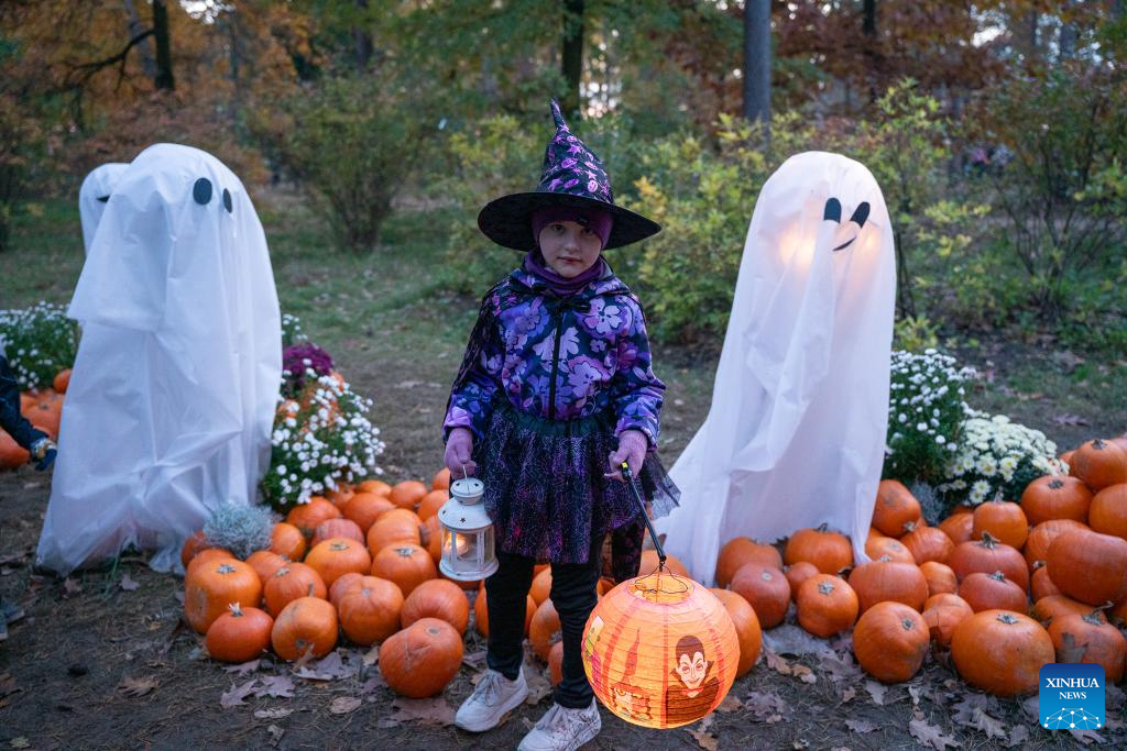 A child poses for a photo in front of a Halloween display at a botanical garden in Prague, the Czech Republic, Oct. 31, 2025. People enjoyed plenty of fun and games at the botanical garden during the Halloween Festival celebrations. (Photo by Dana Kesnerova/Xinhua)