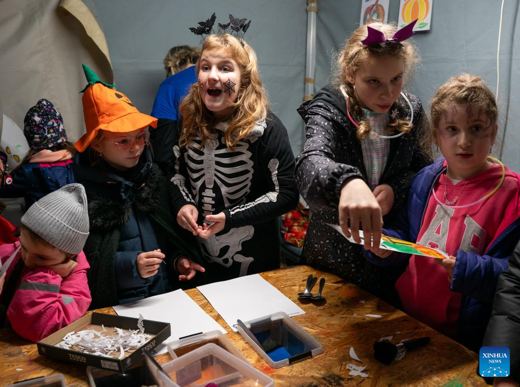 Children make handicrafts at a botanical garden in Prague, the Czech Republic on Oct. 31, 2025. People enjoyed plenty of fun and games at the botanical garden during the Halloween Festival celebrations. (Photo by Dana Kesnerova/Xinhua)