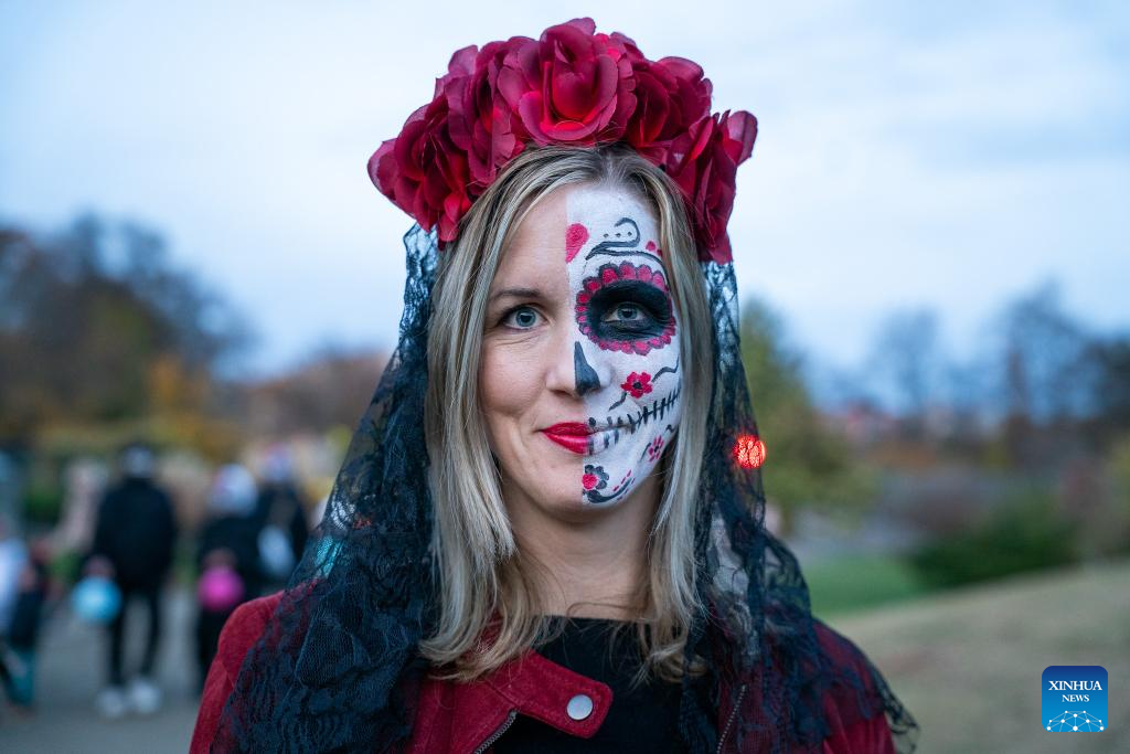 A woman who has her face painted poses for a photo at a botanical garden in Prague, the Czech Republic, Oct. 31, 2025. People enjoyed plenty of fun and games at the botanical garden during the Halloween Festival celebrations. (Photo by Dana Kesnerova/Xinhua)