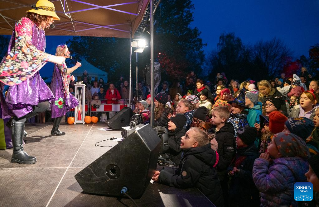 Children watch a performance at a botanical garden in Prague, the Czech Republic, Oct. 31, 2025. People enjoyed plenty of fun and games at the botanical garden during the Halloween Festival celebrations. (Photo by Dana Kesnerova/Xinhua)