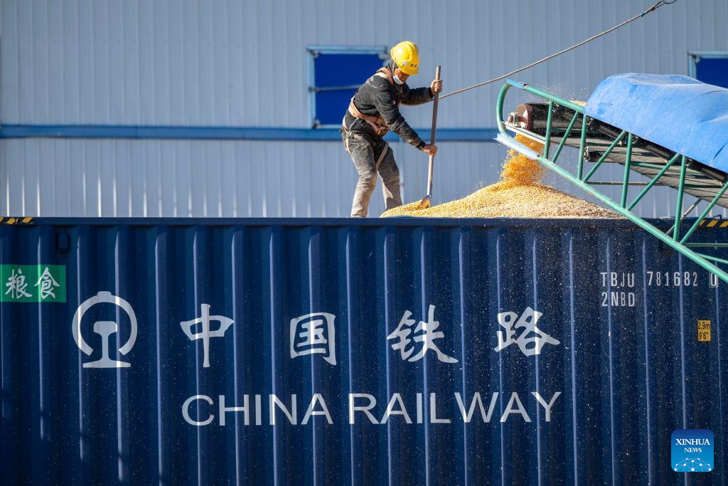 Workers conduct loading operations at a logistics park of China's leading food trader China Oil and FoodStuffs Corporation in Shuangyashan City, northeast China's Heilongjiang Province, Oct. 31, 2025. As Heilongjiang, one of China's major grain-producing province, has recently entered a busy period of grain transportation, China Railway Harbin Group Co., Ltd. has built an efficient and collaborative multimodal transport system, and established a connection mechanism with grain production enterprises in advance, to promote cost reduction, quality improvement and efficiency enhancement of the grain transportation. (Xinhua/Zhang Tao)