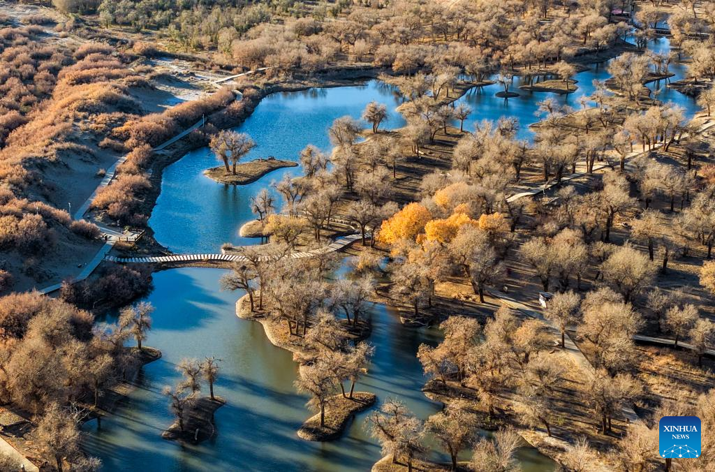 An aerial drone photo taken on Oct. 30, 2025 shows the scenery of a populus euphratica forest in Ejina Banner, north China's Inner Mongolia Autonomous Region. (Xinhua/Lian Zhen)