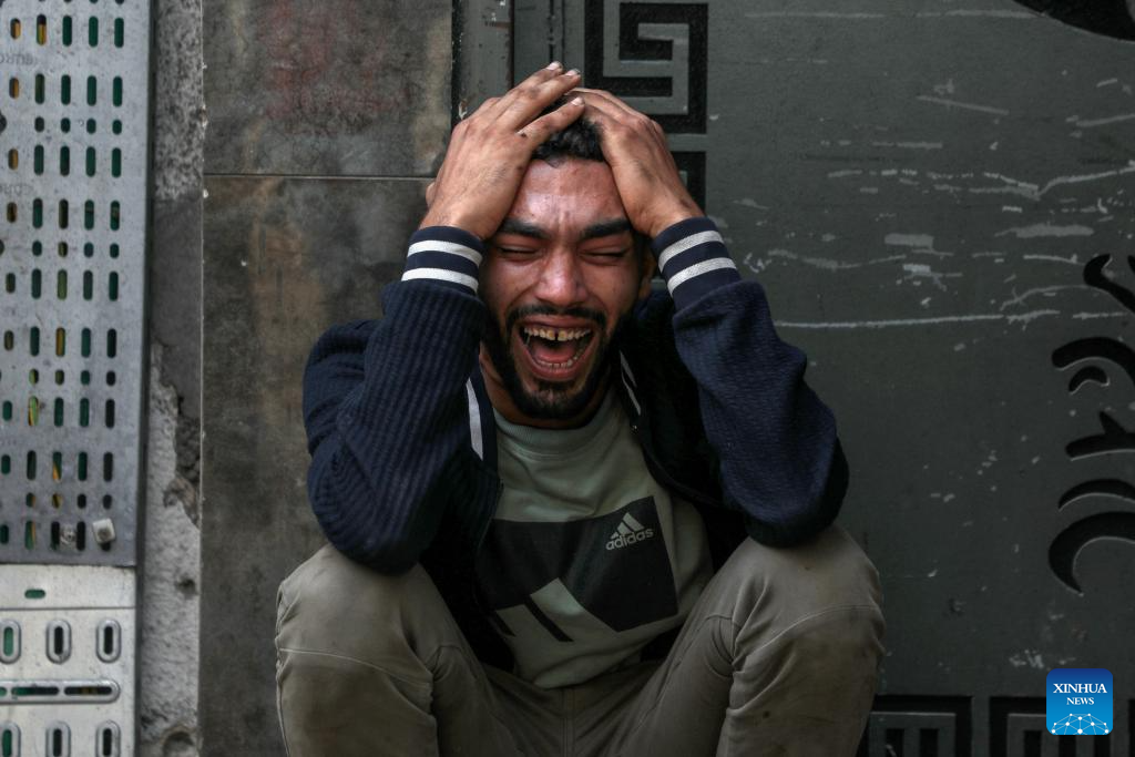 A Palestinian mourns over victims killed during Israeli airstrikes, at al-Shifa hospital in west of Gaza City, Oct. 29, 2025. At least 100 Palestinians were killed in Israeli attacks across the Gaza Strip from late Tuesday to Wednesday, marking the most intense escalation since the ceasefire agreement took effect on October 10. (Photo by Rizek Abdeljawad/Xinhua)