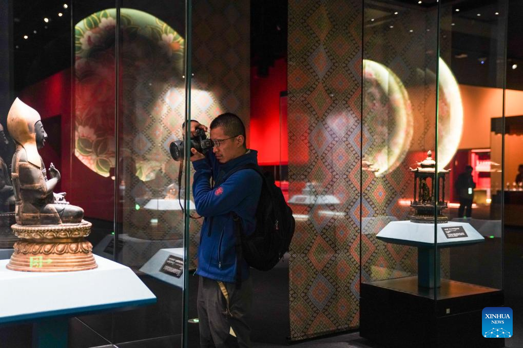 A tourist visits an exhibition at Xizang Museum in Lhasa, southwest China's Xizang Autonomous Region, Oct. 30, 2025. To celebrate the autonomous region's 60th founding anniversary, a joint exhibition showcasing cultural relics from the Palace Museum, the Xizang Museum, the Potala Palace and the Norbulingka is held in Lhasa. (Xinhua/Zhou Jiayi)
