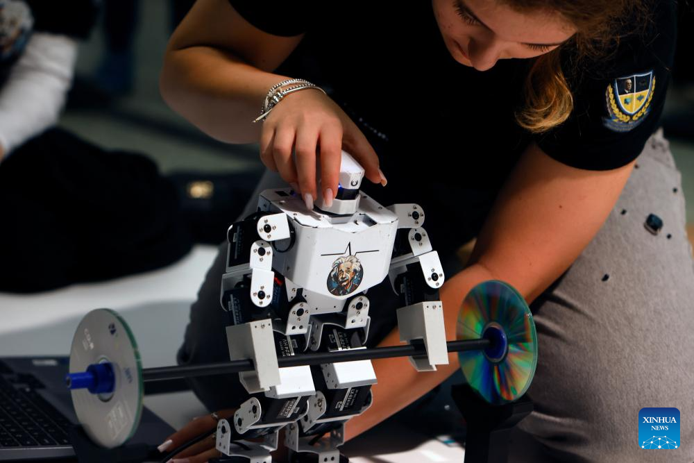 A participant prepares her robot for a contest during the 4th edition of the Robofest, a technology festival, at the Politehnica University of Bucharest in Bucharest, Romania, Nov. 1, 2025. The three-day festival including the 16th edition of the Robochallenge is held here from Oct. 31 to Nov. 2. (Photo by Cristian Cristel/Xinhua)