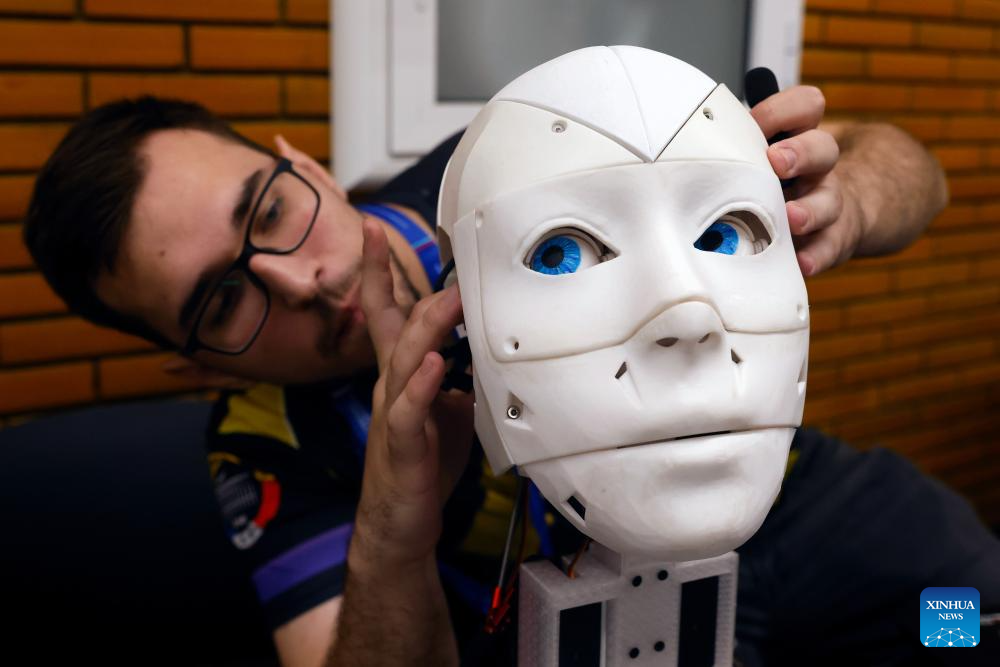 A participant manipulates his humanoid robot head during the 4th edition of the Robofest, a technology festival, at the Politehnica University of Bucharest in Bucharest, Romania, Nov. 1, 2025. The three-day festival including the 16th edition of the Robochallenge is held here from Oct. 31 to Nov. 2. (Photo by Cristian Cristel/Xinhua)