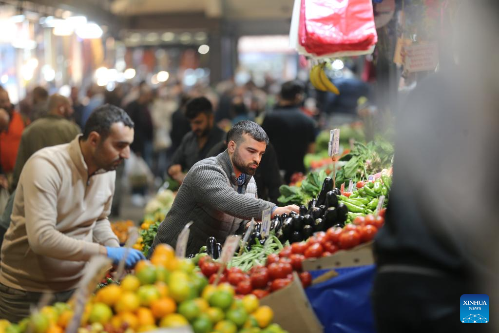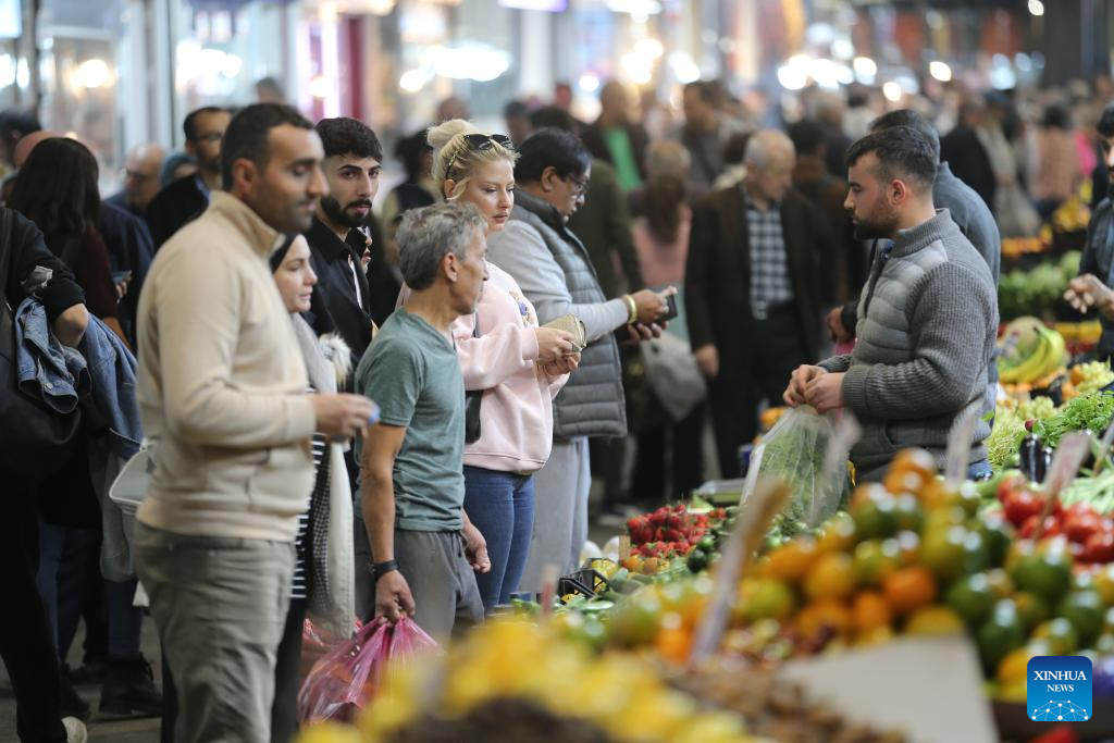People shop at a local market in Ankara, Türkiye, on Nov. 3, 2025. Türkiye's annual inflation slightly eased to 32.87 percent in October, down from 33.29 percent in September, official data showed Monday.
