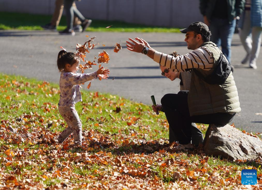 A girl plays among fallen leaves at the New York Botanical Garden in New York, the United States, on Nov. 2, 2025.
