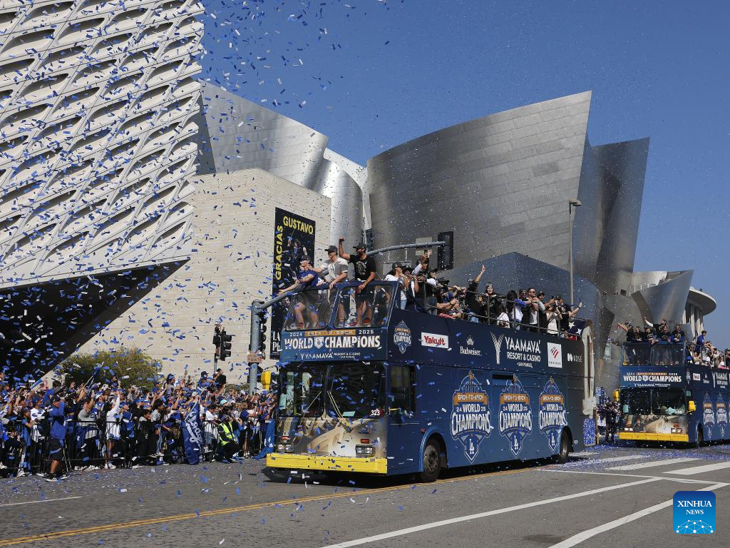 Fans cheer as buses carrying players of Los Angeles Dodgers passing by during the Los Angeles Dodgers' victory parade in Los Angeles, California, the United States, on Nov. 3, 2025. On Saturday, the Dodgers clinched the 2025 MLB World Series title with a victory over the Toronto Blue Jays. (Photo by Qiu Chen/Xinhua)