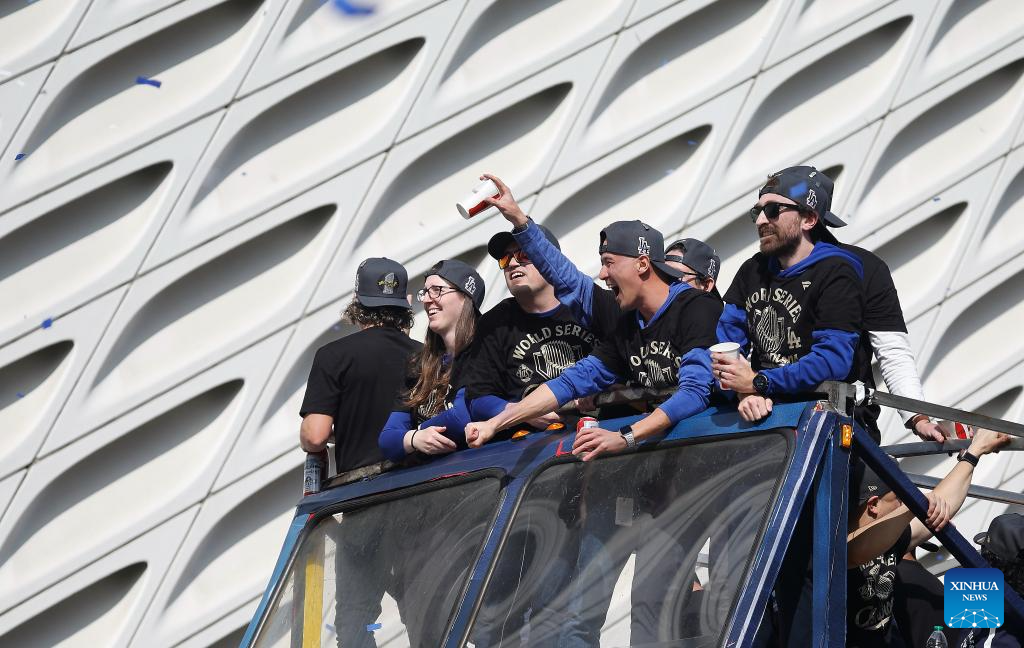Players and family members of Los Angeles Dodgers wave to fans during the Los Angeles Dodgers' victory parade in Los Angeles, California, the United States, on Nov. 3, 2025. On Saturday, the Dodgers clinched the 2025 MLB World Series title with a victory over the Toronto Blue Jays. (Photo by Qiu Chen/Xinhua)