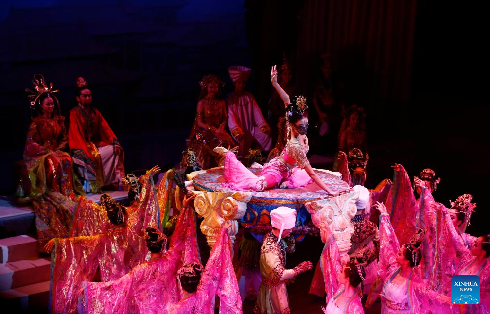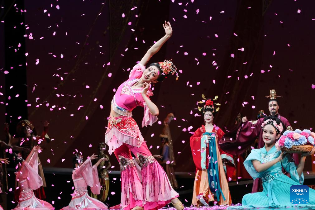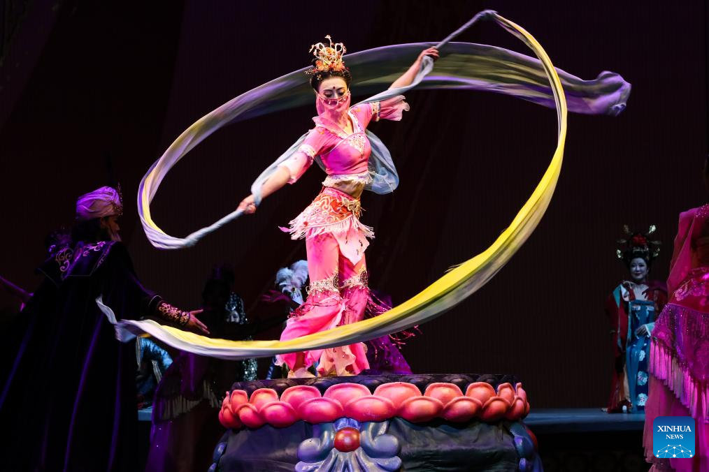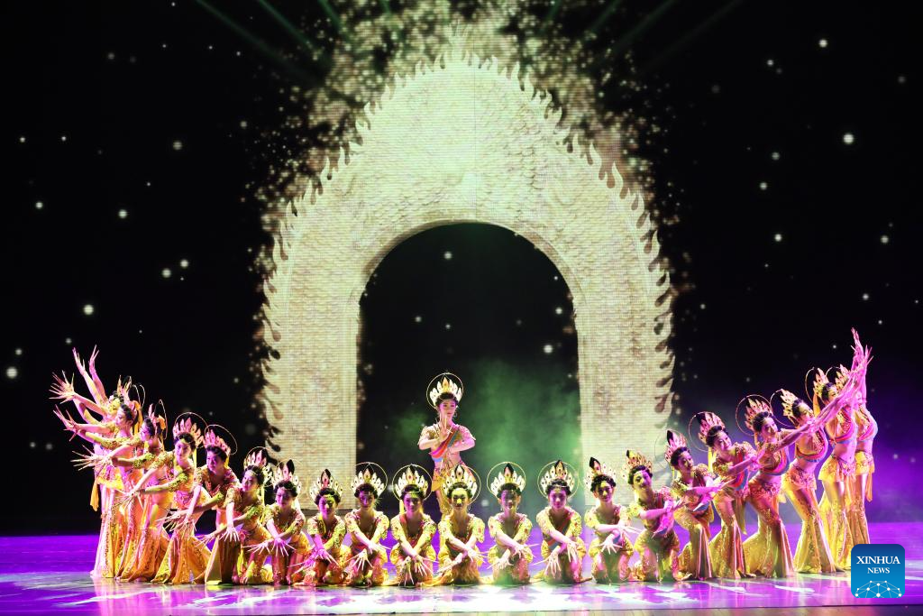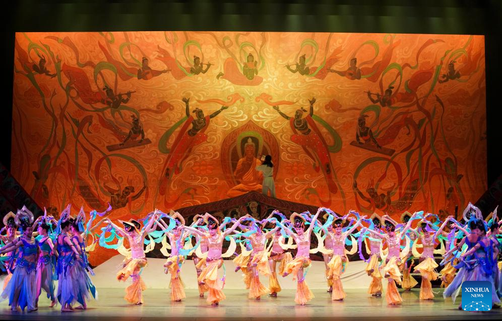 The dance drama "Flower Rains Along Silk Road" is staged at the Dunhuang Theater in Dunhuang, northwest China's Gansu Province, Sept. 20, 2025.(Xinhua/Lang Bingbing)