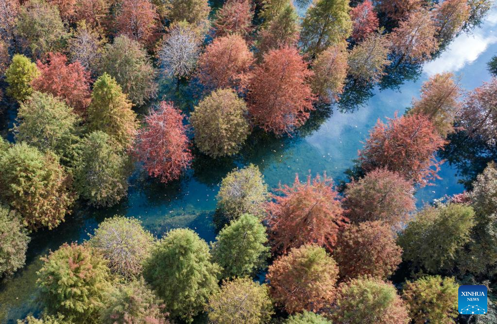 An aerial drone photo taken on Nov. 5, 2025 shows the autumn scenery of a forest park in Changxing County of Huzhou City, east China's Zhejiang Province. (Photo by Tan Yunfeng/Xinhua)