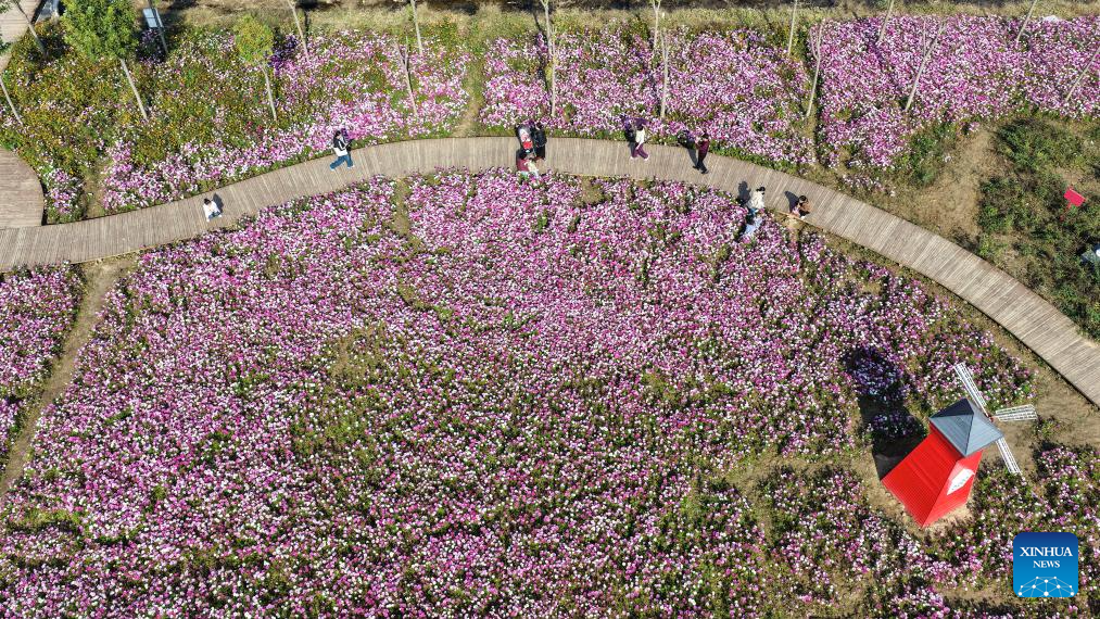 An aerial drone photo taken on Nov. 5, 2025 shows people admiring blooming flowers at a scenic area in Guangrao County of Dongying City, east China's Shandong Province. (Photo by Liu Yunjie/Xinhua)