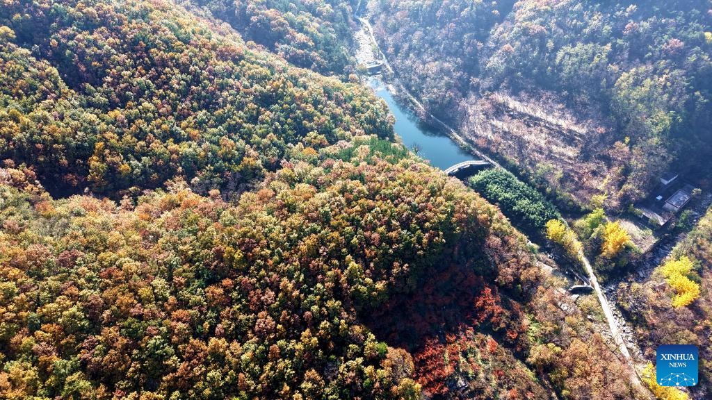 An aerial drone photo taken on Nov. 5, 2025 shows the autumn scenery of a scenic area in Pingyi County of Linyi City, east China's Shandong Province. (Photo by Wu Jiquan/Xinhua)