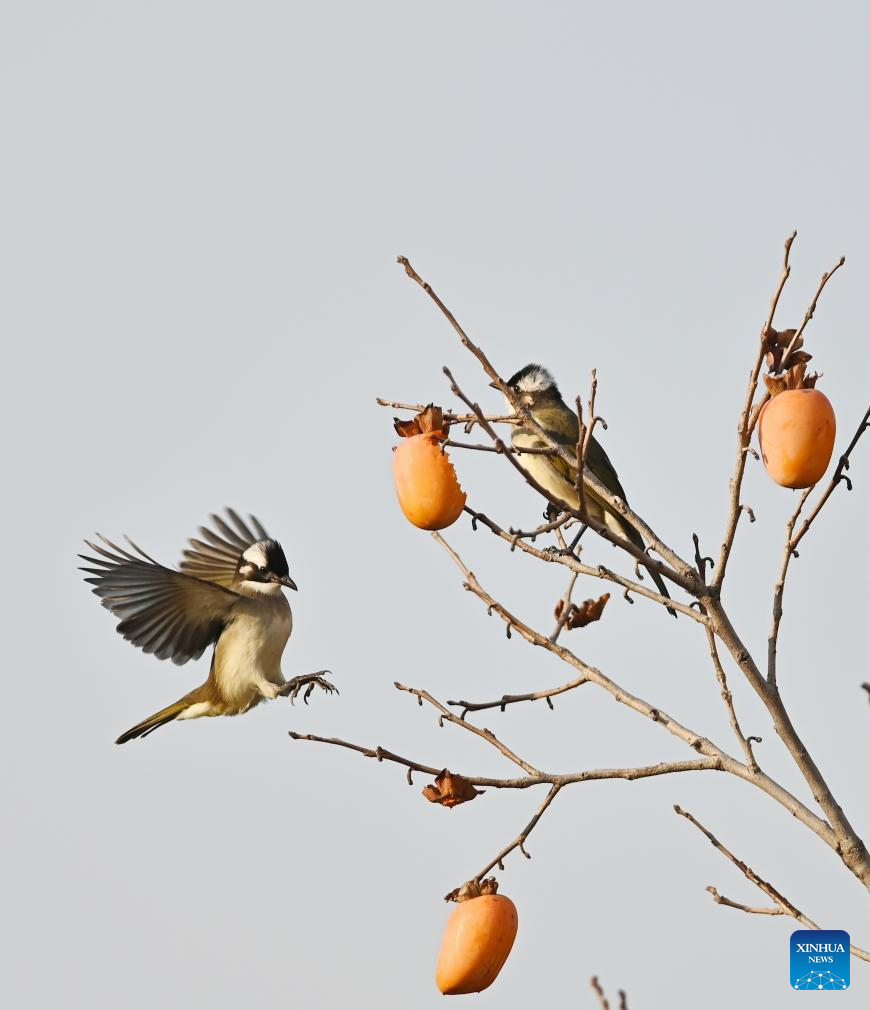 Birds perch on a fruiting persimmon tree at a park in Tengzhou City, east China's Shandong Province, Nov. 4, 2025. (Photo by Li Zhijun/Xinhua)