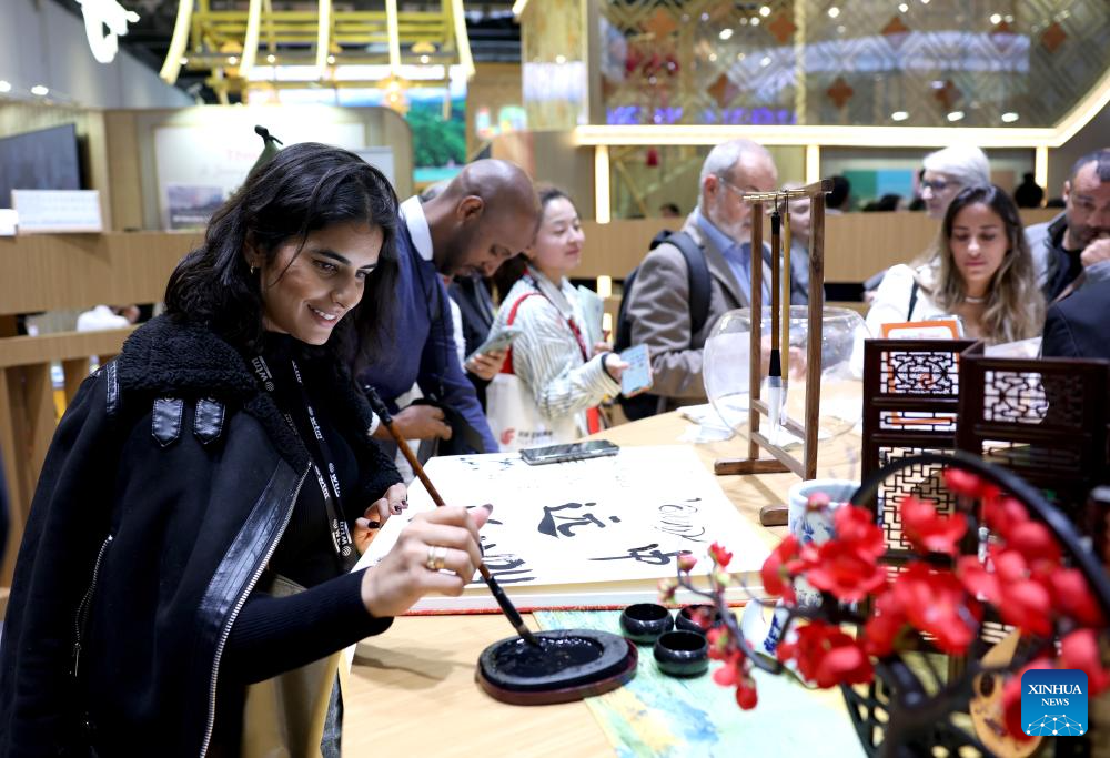 A woman experiences Chinese calligraphy at the China pavilion of the World Travel Market (WTM) London 2025 in London, Britain, Nov. 4, 2025. The WTM London 2025 opened on Tuesday, with the China pavilion drawing attention for its abundant tourism resources and cultural appeal. (Xinhua/Li Ying)