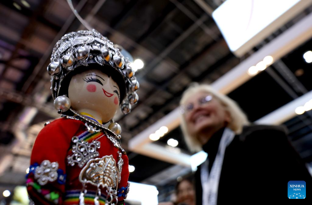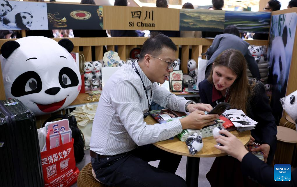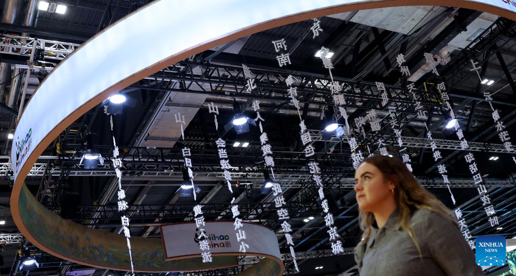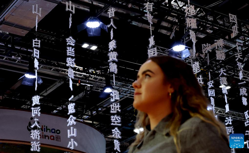 A woman visits the China pavilion of the World Travel Market (WTM) London 2025 in London, Britain, Nov. 4, 2025. The WTM London 2025 opened on Tuesday, with the China pavilion drawing attention for its abundant tourism resources and cultural appeal. (Xinhua/Li Ying)