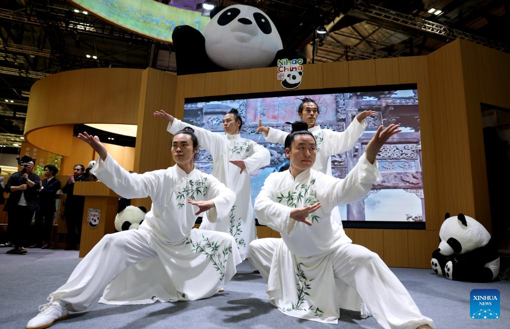 Wudang kung fu performance is staged at the China pavilion of the World Travel Market (WTM) London 2025 in London, Britain, Nov. 4, 2025. The WTM London 2025 opened on Tuesday, with the China pavilion drawing attention for its abundant tourism resources and cultural appeal. (Xinhua/Li Ying)
