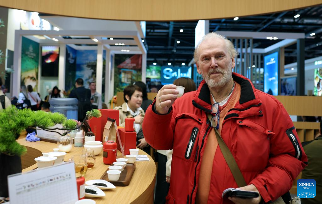 A man tastes Chinese tea at the China pavilion of the World Travel Market (WTM) London 2025 in London, Britain, Nov. 4, 2025. The WTM London 2025 opened on Tuesday, with the China pavilion drawing attention for its abundant tourism resources and cultural appeal. (Xinhua/Li Ying)