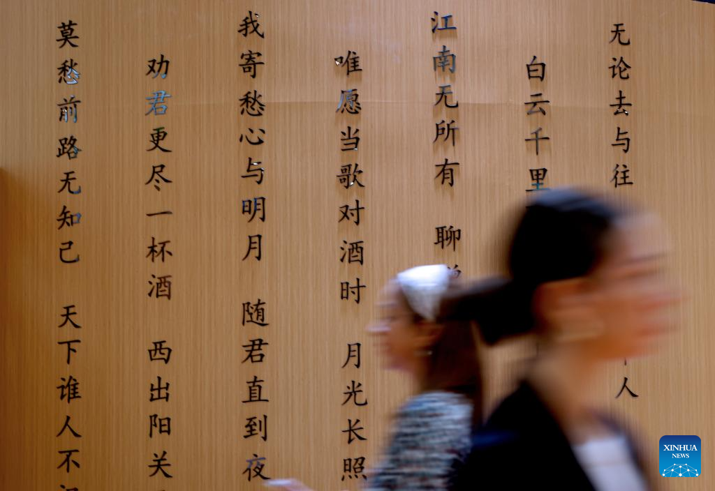 This photo taken on Nov. 4, 2025 shows a view of "Chinese poems" at the China pavilion of the World Travel Market (WTM) London 2025 in London, Britain. The WTM London 2025 opened on Tuesday, with the China pavilion drawing attention for its abundant tourism resources and cultural appeal. (Xinhua/Li Ying)