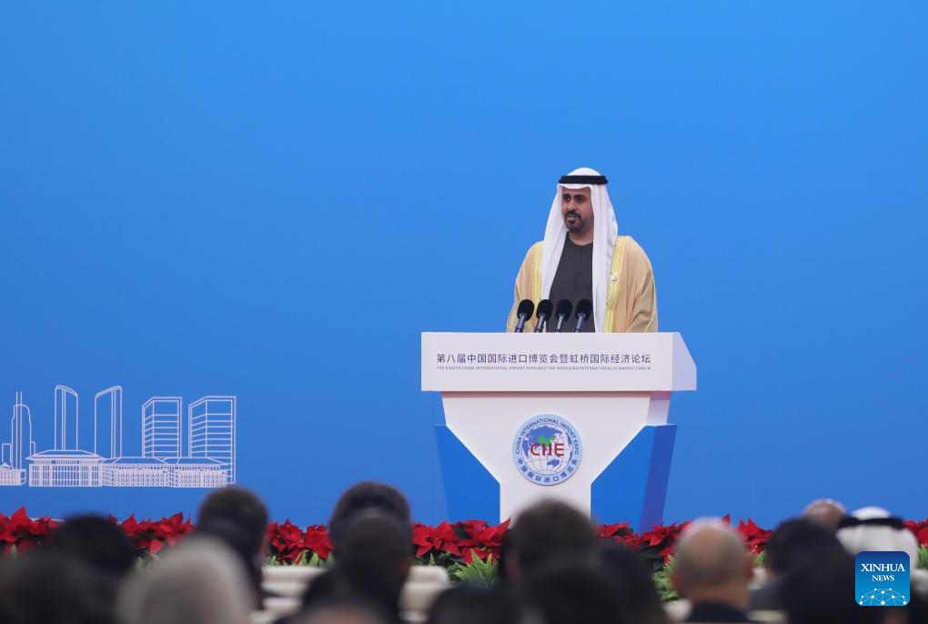 Sheikh Theyab bin Mohamed bin Zayed Al Nahyan, Special Representative of the President of the United Arab Emirates, delivers a speech at the opening ceremony of the eighth China International Import Expo (CIIE) and the Hongqiao International Economic Forum in Shanghai, east China, Nov. 5, 2025.