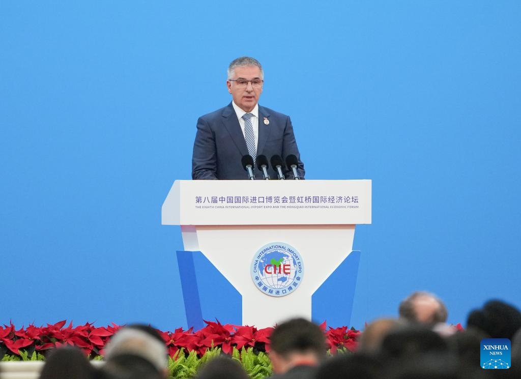 President of the National Council of Slovenia Marko Lotric delivers a speech at the opening ceremony of the eighth China International Import Expo (CIIE) and the Hongqiao International Economic Forum in Shanghai, east China, Nov. 5, 2025.