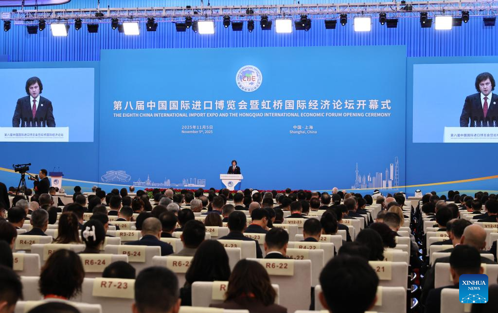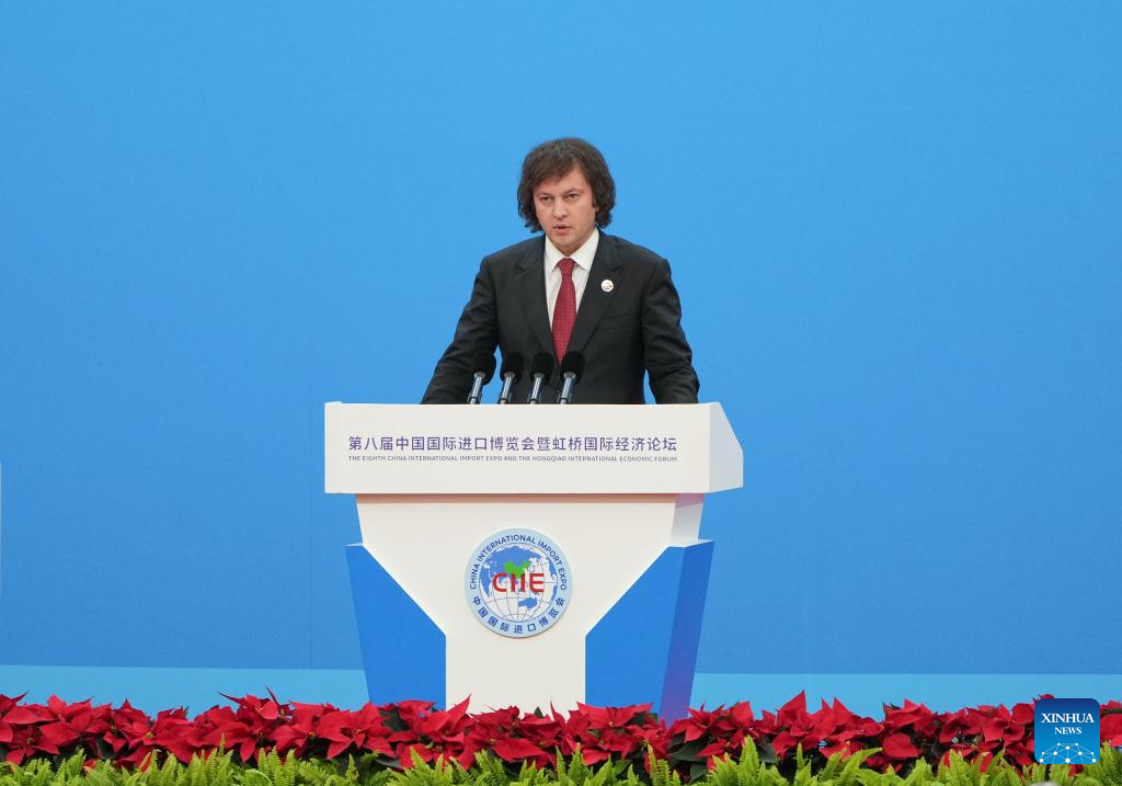 Georgian Prime Minister Irakli Kobakhidze delivers a speech at the opening ceremony of the eighth China International Import Expo (CIIE) and the Hongqiao International Economic Forum in Shanghai, east China, Nov. 5, 2025.