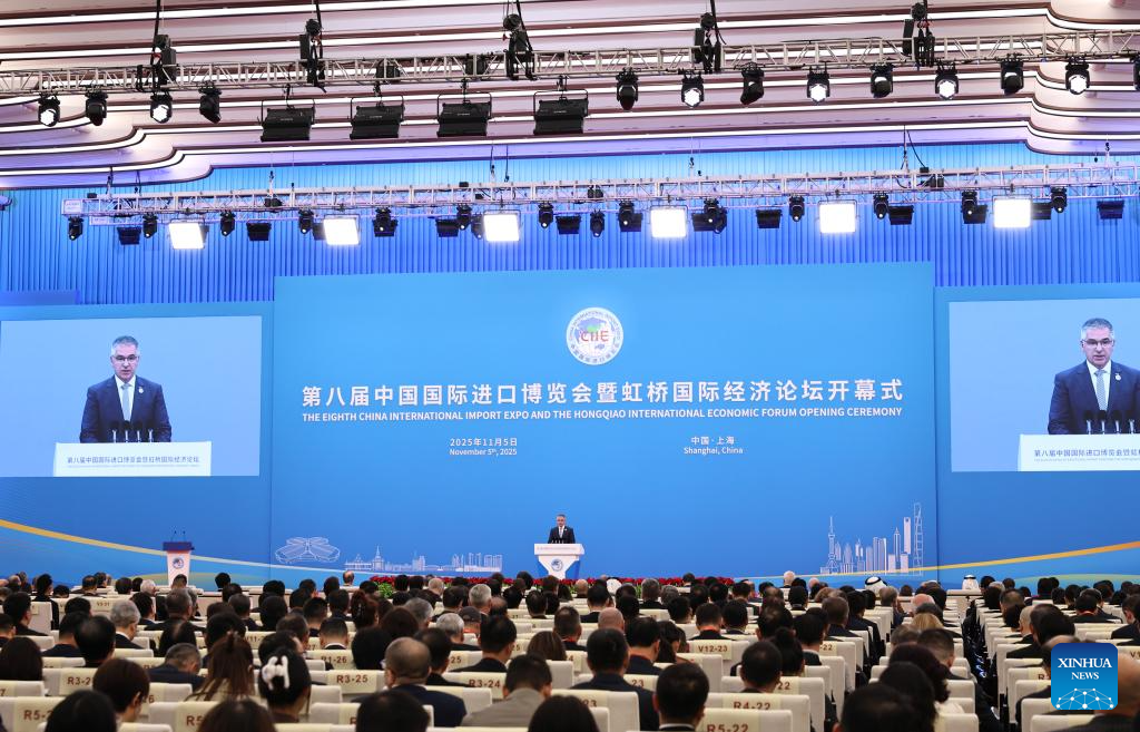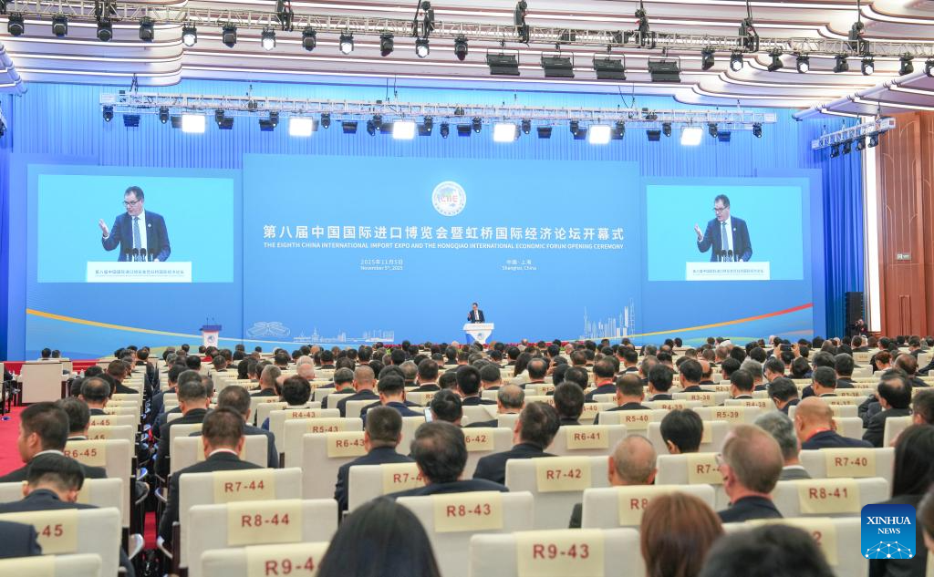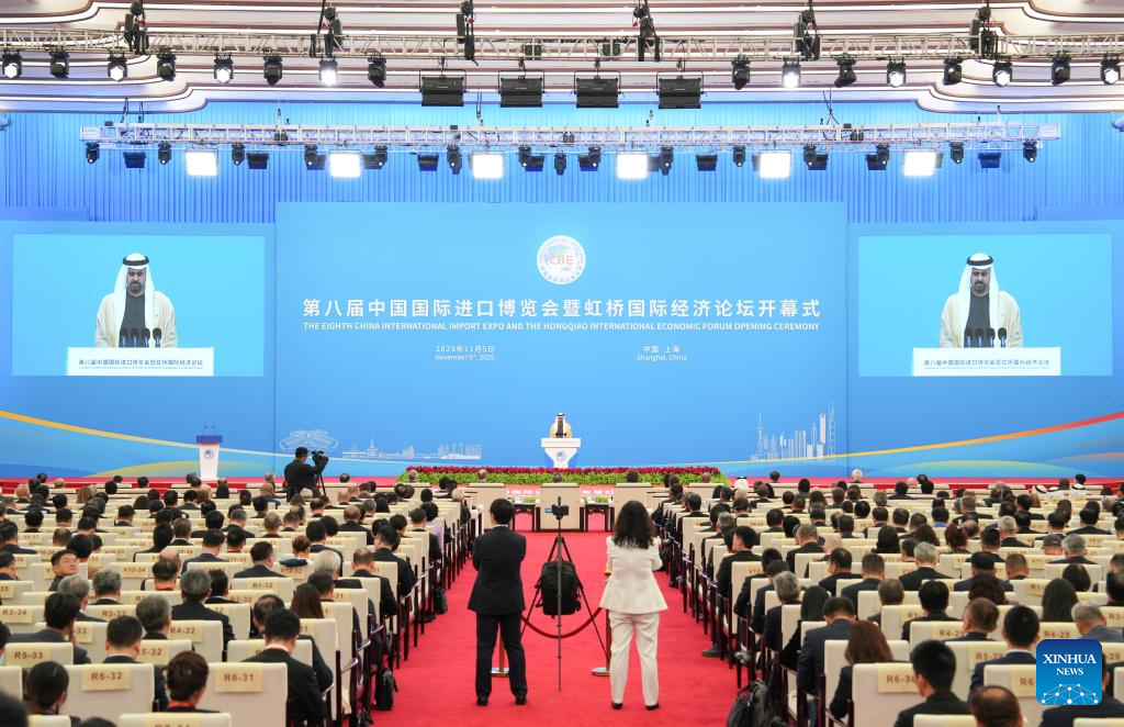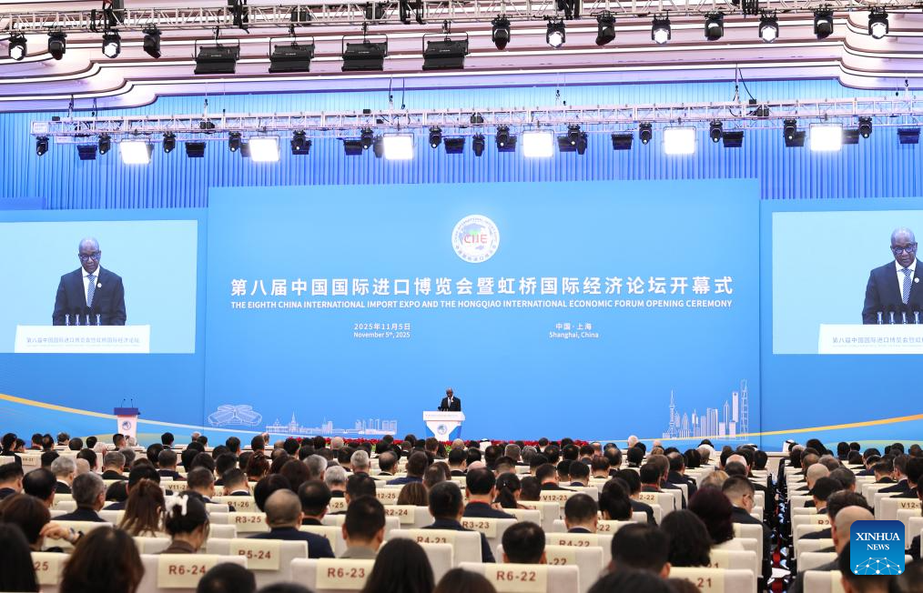 This photo taken on Nov. 5, 2025 shows a scene at the opening ceremony of the eighth China International Import Expo (CIIE) and the Hongqiao International Economic Forum in Shanghai, east China.