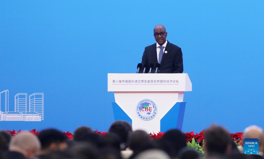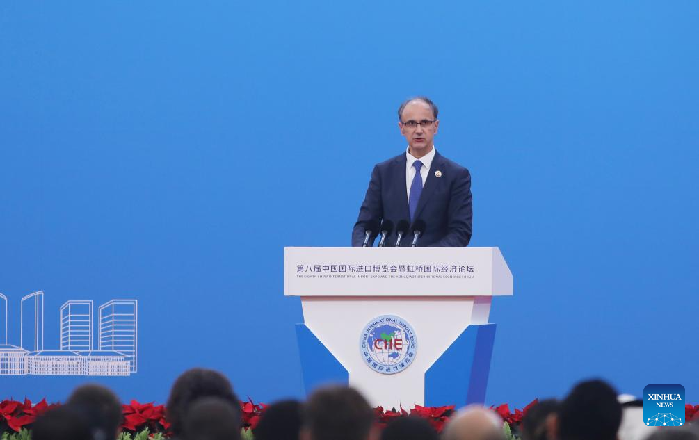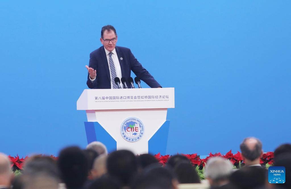 Gerd Mueller, Director General of the United Nations Industrial Development Organization, delivers a speech at the opening ceremony of the eighth China International Import Expo (CIIE) and the Hongqiao International Economic Forum in Shanghai, east China, Nov. 5, 2025.