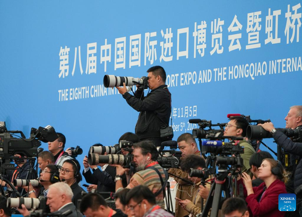 Photojournalists work at the opening ceremony of the eighth China International Import Expo (CIIE) and the Hongqiao International Economic Forum in Shanghai, east China, Nov. 5, 2025.