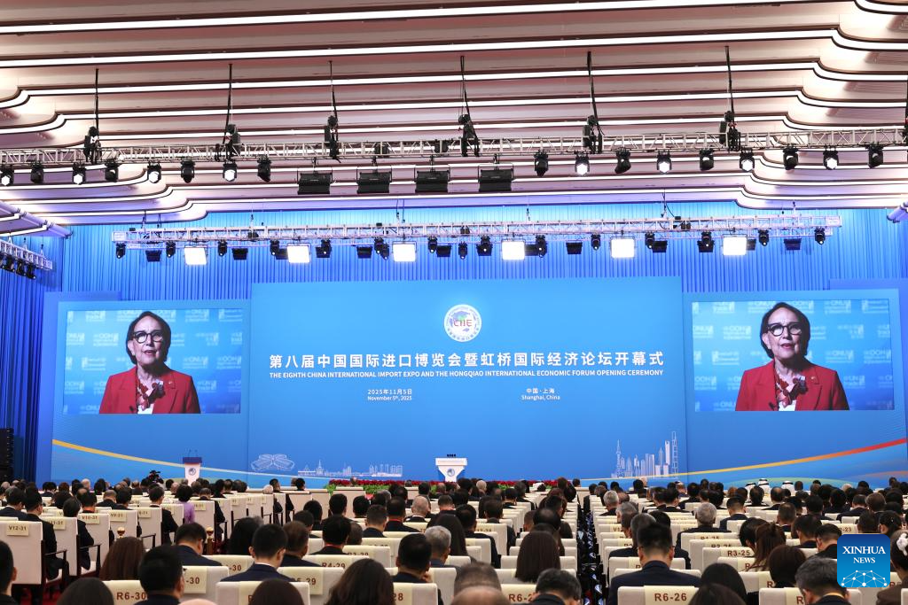 Rebeca Grynspan, Secretary-General of the United Nations Conference on Trade and Development, delivers a speech via video at the opening ceremony of the eighth China International Import Expo (CIIE) and the Hongqiao International Economic Forum in Shanghai, east China, Nov. 5, 2025.