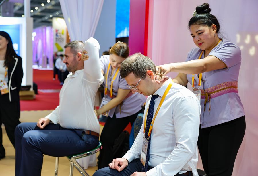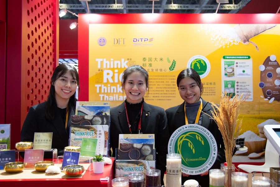Visitors experience Thai massage at the Thailand Pavilion during the eighth China International Import Expo (CIIE) in east China's Shanghai, Nov. 5, 2025. (Xinhua/Wang Zecong)This photo shows rice products exhibited at the Thailand Pavilion during the eighth China International Import Expo (CIIE) in east China's Shanghai, Nov. 5, 2025. (Xinhua/Tian Weiwei)Staff members pose for a group photo at the Thailand Pavilion during the eighth China International Import Expo (CIIE) in east China's Shanghai, Nov. 5, 2025. (Xinhua/Tian Weiwei)