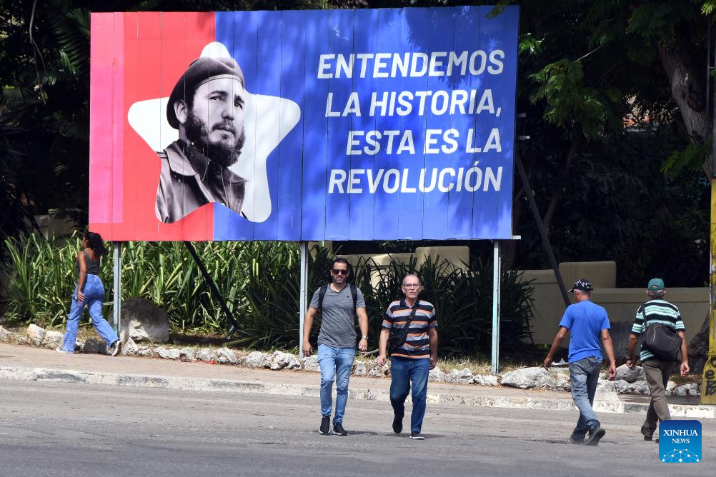 Pedestrians walk past a billboard bearing a portrait of Cuban revolutionary leader Fidel Castro in Havana, capital of Cuba, Nov. 5, 2025. (Photo by Joaquín Hernández/Xinhua)