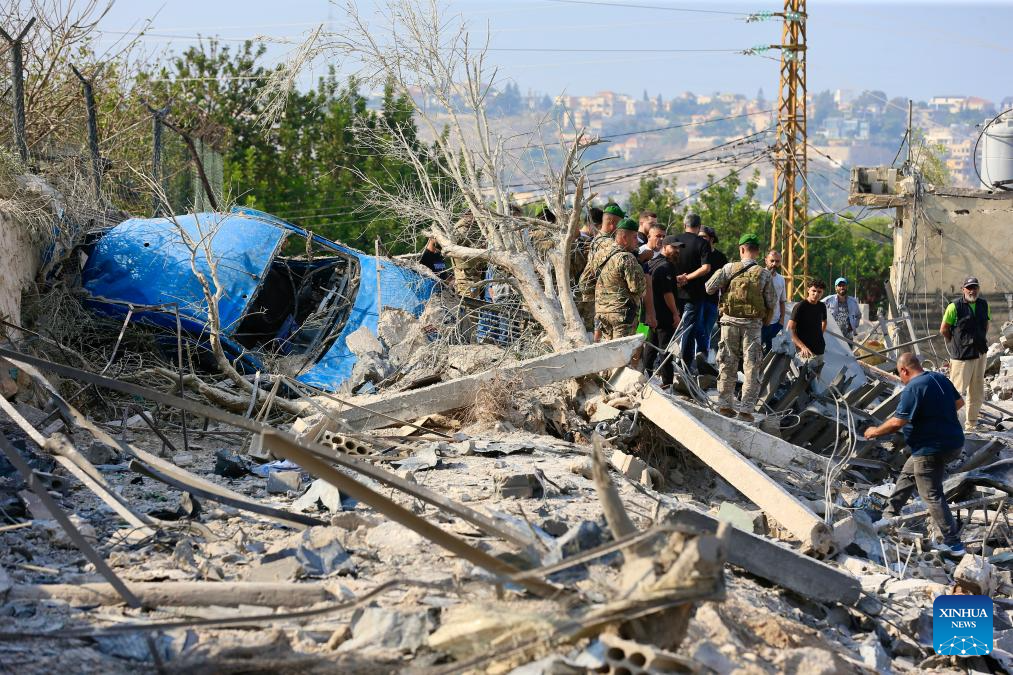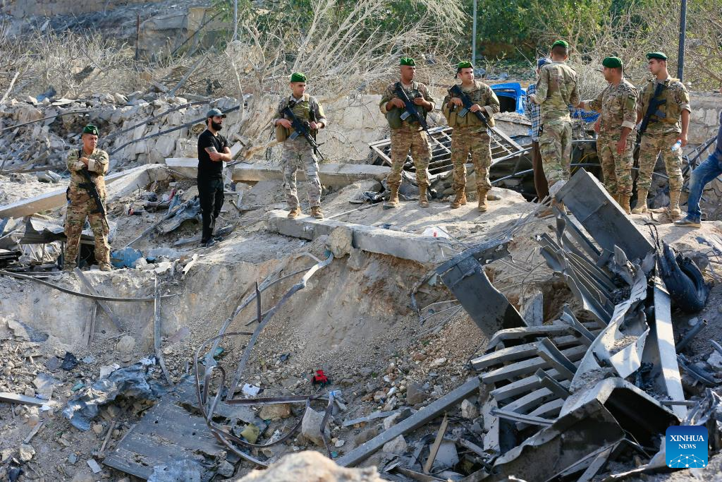 This photo taken on Nov. 6, 2025 shows Lebanese people and soldiers inspecting the site of an Israeli airstrike in the town of Abbassiyeh, Lebanon. One person was killed, and three others injured on Thursday in an Israeli airstrike in southern Lebanon, the National News Agency (NNA) reported.