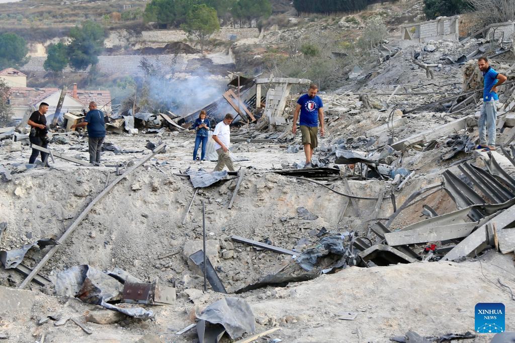 This photo taken on Nov. 6, 2025 shows Lebanese people and soldiers inspecting the site of an Israeli airstrike in the town of Abbassiyeh, Lebanon. (Photo by Ali Hashisho/Xinhua)