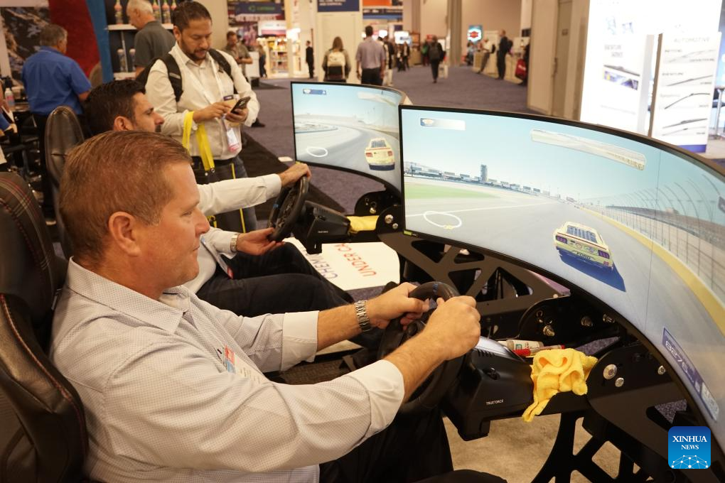 People experience simulated driving on a screen during the Automotive Aftermarket Products Expo 2025 (AAPEX) in Las Vegas, Nevada, the United States, Nov. 4, 2025. Two major U.S. automotive industry trade shows are being held this week in Las Vegas, U.S. state of Nevada, focusing on artificial intelligence (AI) and emerging clean-energy trends in vehicle technology and mobility services.