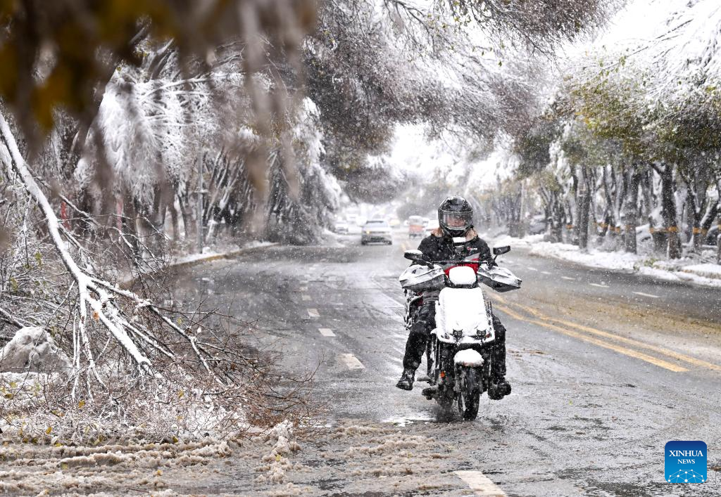 A deliveryman rides on a street after snow in Urumqi, northwest China's Xinjiang Uygur Autonomous Region, Nov. 6, 2025. A blizzard has swept across many parts of northwest China's Xinjiang Uygur Autonomous Region since Wednesday, disrupting traffic in several areas and setting a new precipitation record in the regional capital, Urumqi. (Xinhua/Wang Fei)
