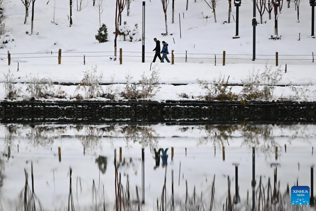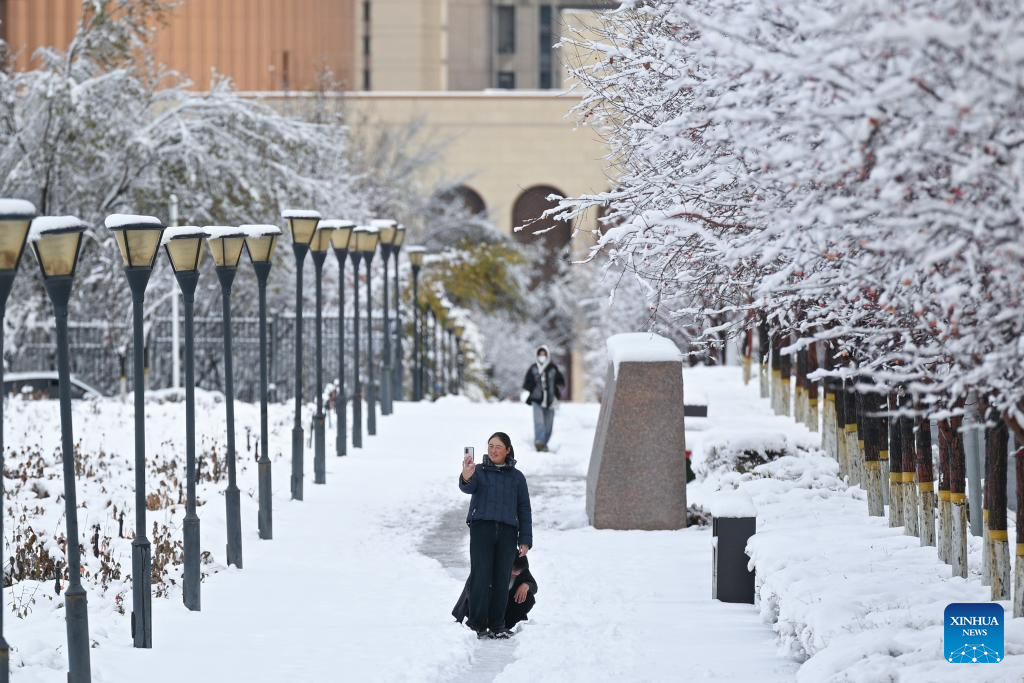 People visit a park after snow in Urumqi, northwest China's Xinjiang Uygur Autonomous Region, Nov. 6, 2025. A blizzard has swept across many parts of northwest China's Xinjiang Uygur Autonomous Region since Wednesday, disrupting traffic in several areas and setting a new precipitation record in the regional capital, Urumqi. (Xinhua/Xin Yuewei)