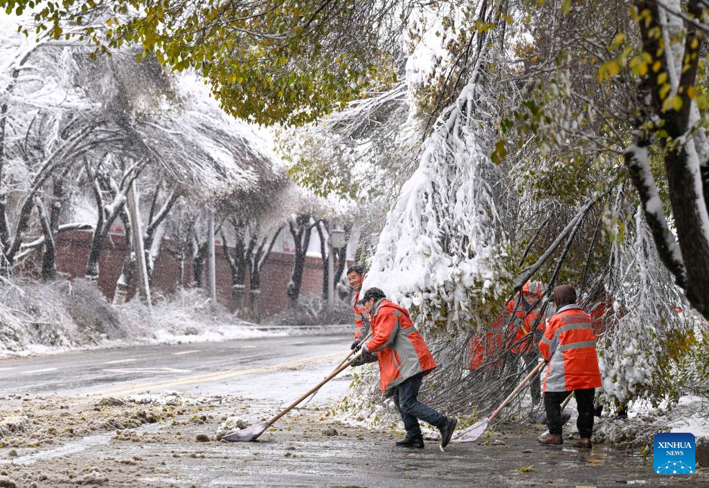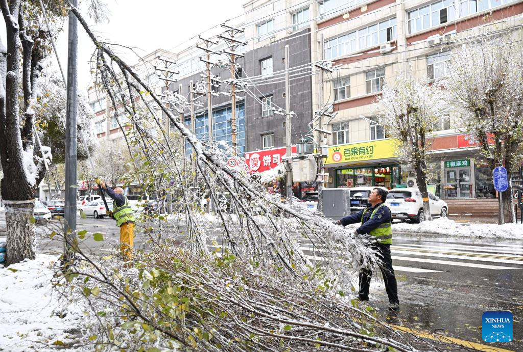 Workers saw off a tree branch that was about to break due to accumulation of snow in Urumqi, northwest China's Xinjiang Uygur Autonomous Region, Nov. 6, 2025. A blizzard has swept across many parts of northwest China's Xinjiang Uygur Autonomous Region since Wednesday, disrupting traffic in several areas and setting a new precipitation record in the regional capital, Urumqi. (Xinhua/Wang Fei)