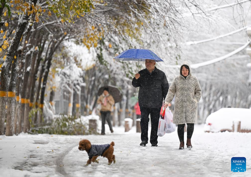 People walk on a street after snow in Urumqi, northwest China's Xinjiang Uygur Autonomous Region, Nov. 6, 2025. A blizzard has swept across many parts of northwest China's Xinjiang Uygur Autonomous Region since Wednesday, disrupting traffic in several areas and setting a new precipitation record in the regional capital, Urumqi. (Xinhua/Xin Yuewei)