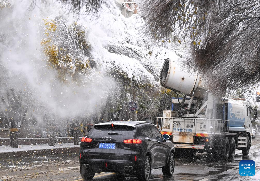 Sanitation workers use machinery to blow off snow which accumulated on treetops to prevent branches from breaking in Urumqi, northwest China's Xinjiang Uygur Autonomous Region, Nov. 6, 2025. A blizzard has swept across many parts of northwest China's Xinjiang Uygur Autonomous Region since Wednesday, disrupting traffic in several areas and setting a new precipitation record in the regional capital, Urumqi. (Xinhua/Wang Fei)