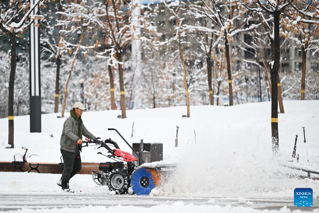 A worker clears snow at a park in Urumqi, northwest China's Xinjiang Uygur Autonomous Region, Nov. 6, 2025. A blizzard has swept across many parts of northwest China's Xinjiang Uygur Autonomous Region since Wednesday, disrupting traffic in several areas and setting a new precipitation record in the regional capital, Urumqi. (Xinhua/Xin Yuewei)