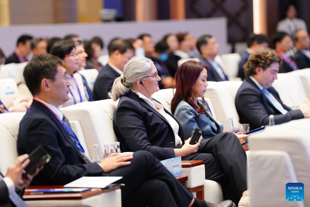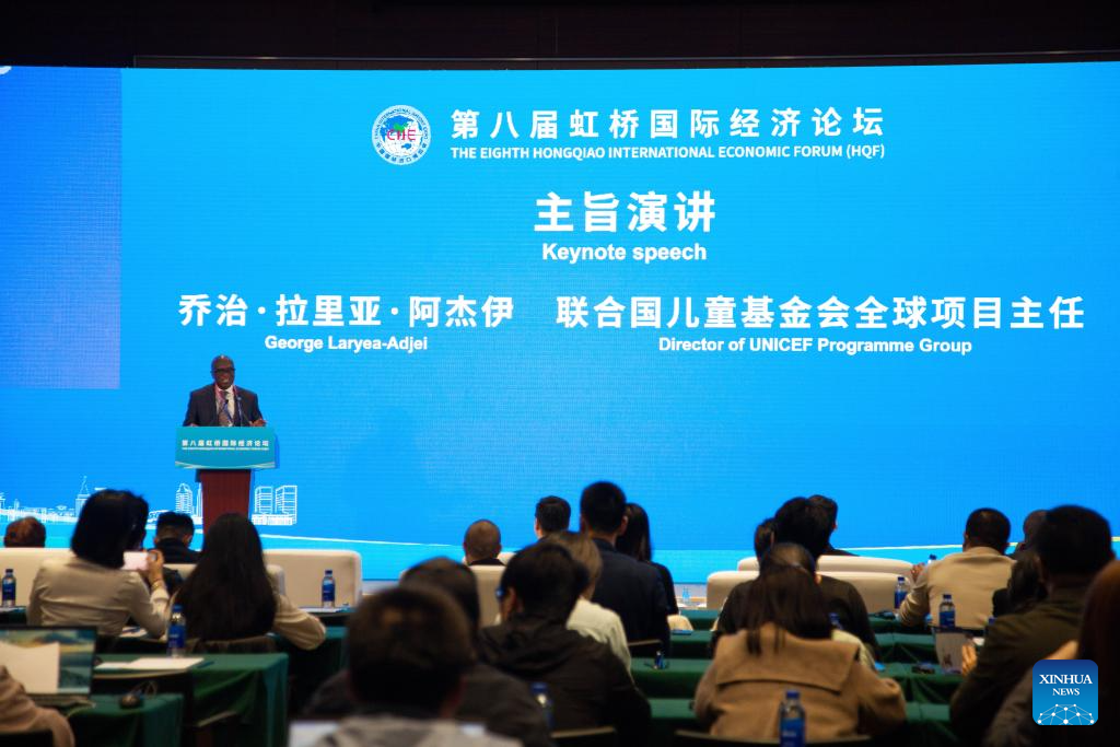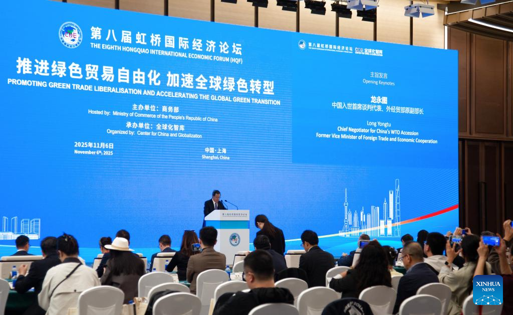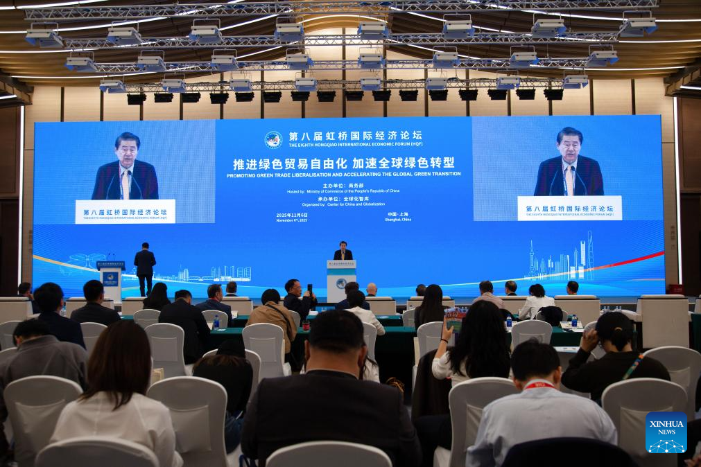 A sub-forum titled "Promoting Green Trade Liberalization and Accelerating the Global Green Transition" is held during the 8th Hongqiao International Economic Forum at the National Exhibition and Convention Center (Shanghai) in Shanghai, east China, Nov. 6, 2025. (Xinhua/Tian Weiwei)